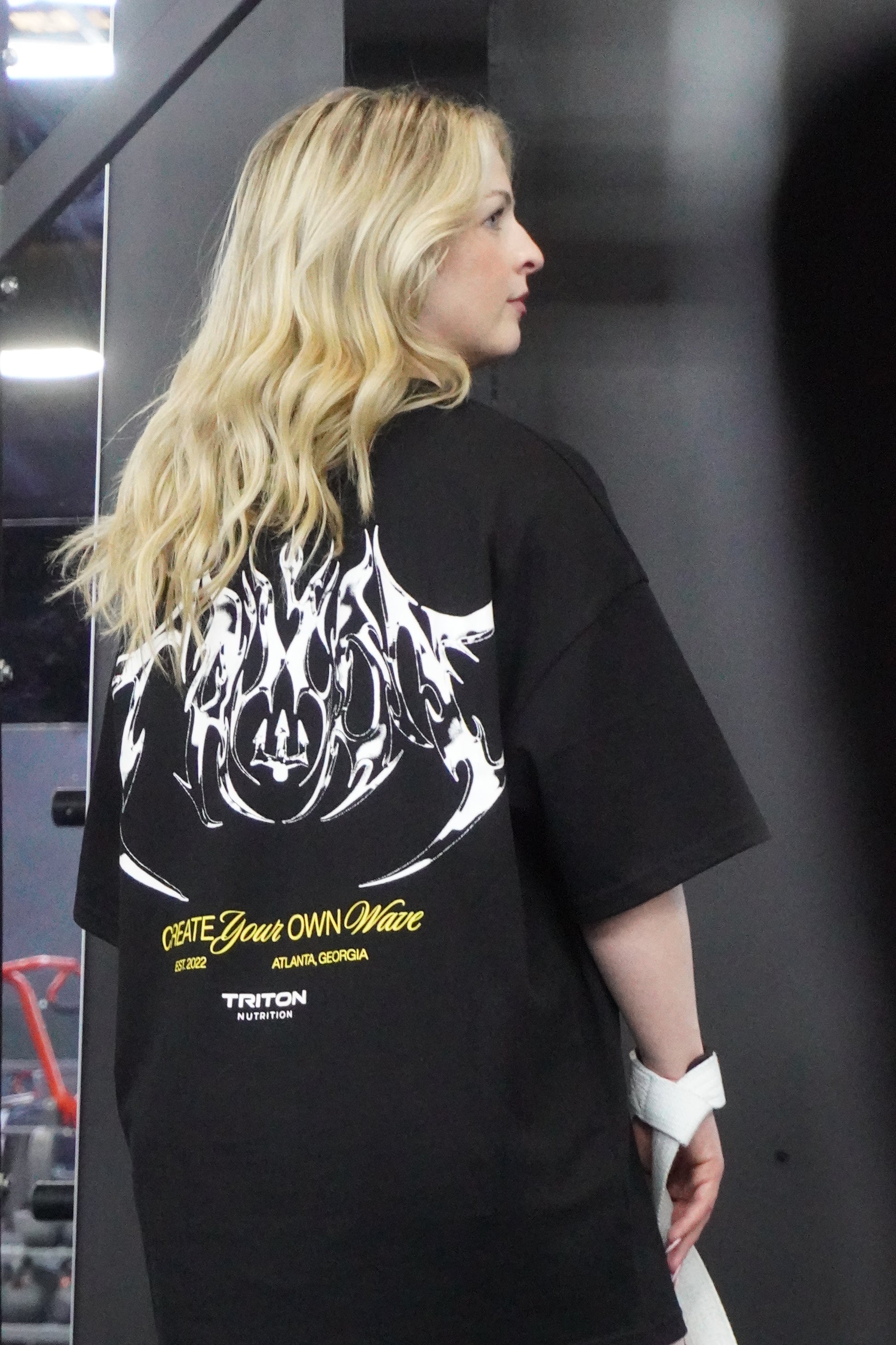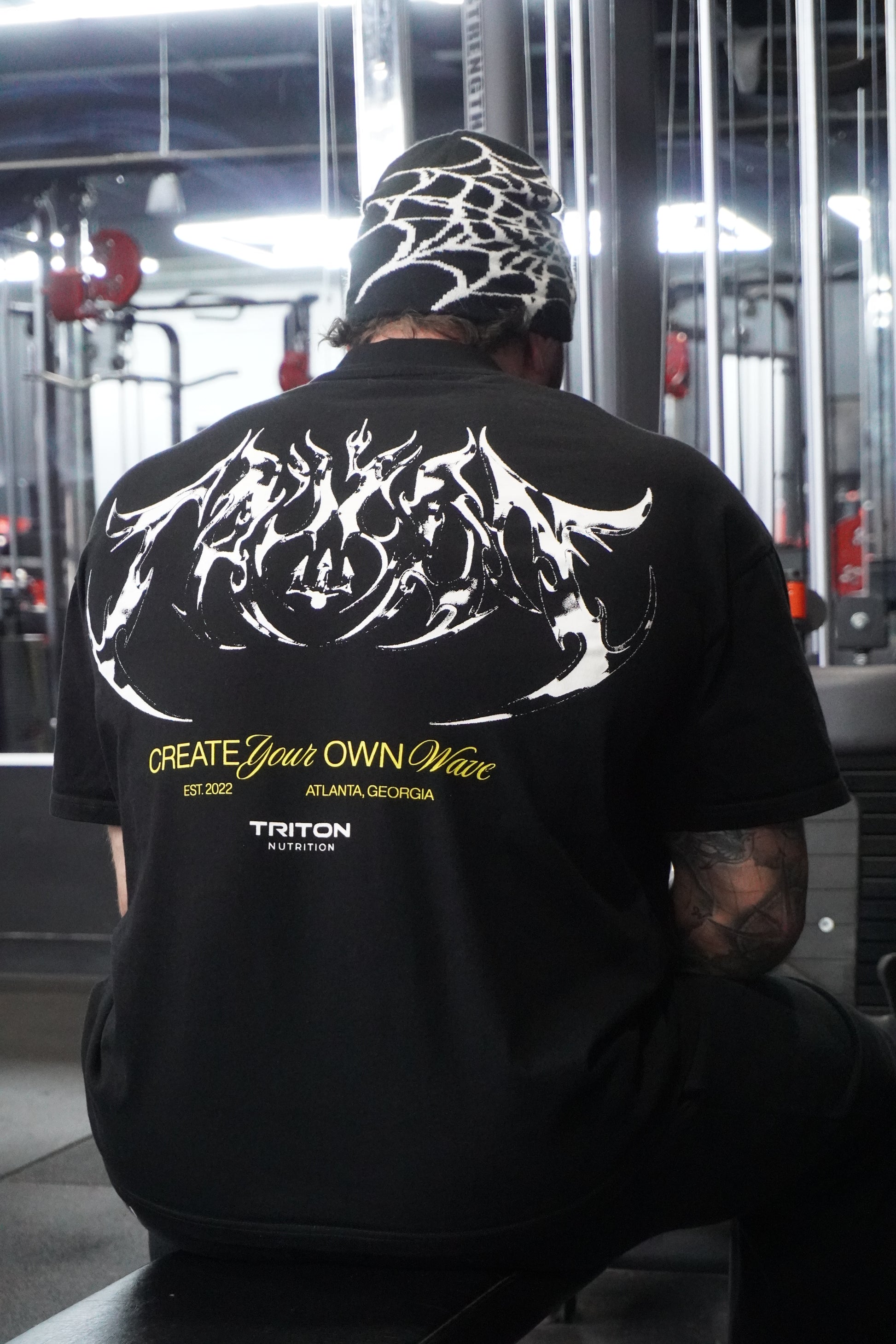 This oversized black pump cover features our bold Triton wave graphic across the back with the signature “Create Your Own Wave” mantra — a reminder to dominate your training and move with purpose. Designed for heavy lift days, warm-ups, and that locked-in pre-workout mindset, it delivers a relaxed, athletic fit that sits comfortably over your physique without restricting movement.