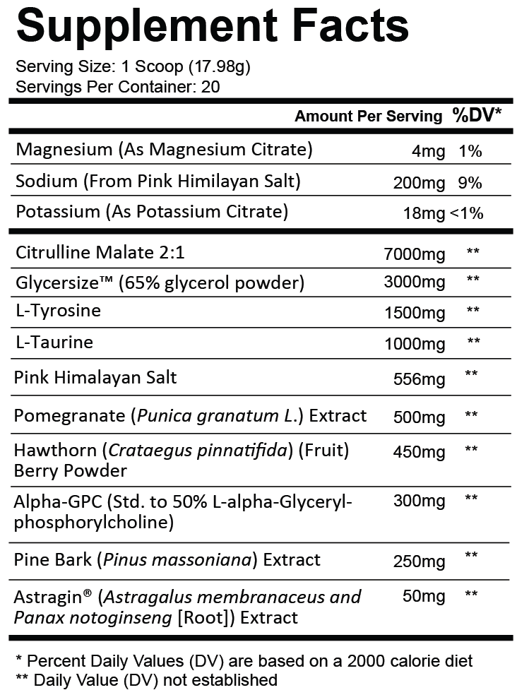 Formulated with 7g of Citrulline Malate for explosive nitric oxide output and 3g of GlycerSize™ for full-cell hydration, SURGE drives blood flow, vascularity, and muscle fullness through every rep. Added L-Tyrosine and Alpha-GPC sharpen mental clarity, while Taurine and electrolytes keep you hydrated and balanced from start to finish.
